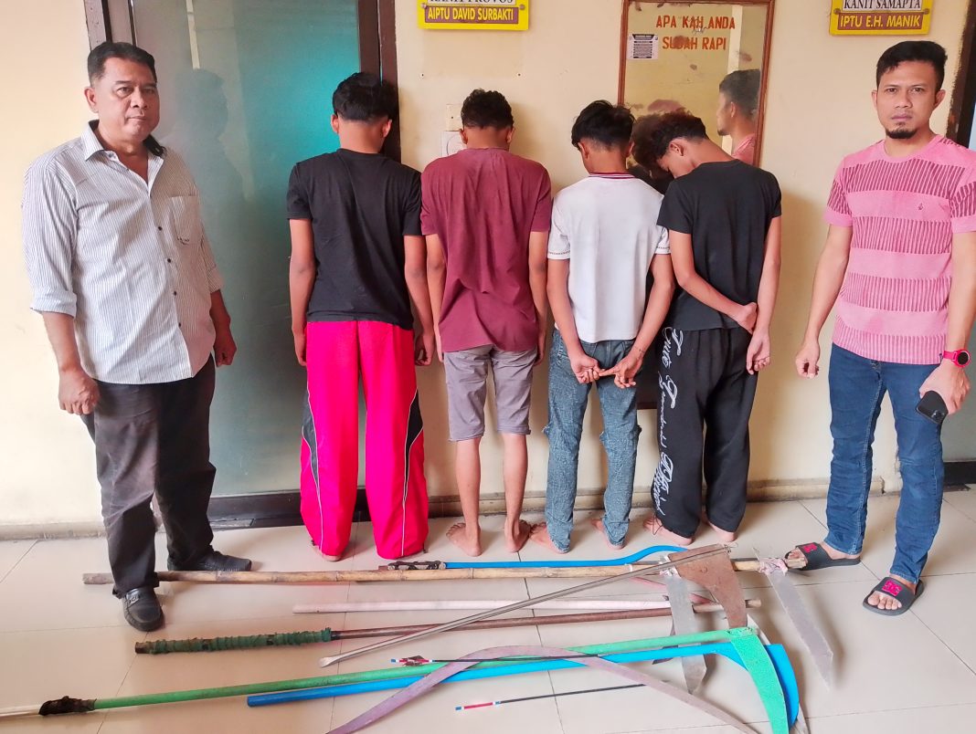 ” Dapat kami jelaskan pada saat itu kami menerima informasi bahwa telah terjadi tawuran di jalan Bromo depan Fashion, kecamatan Medan Area. Pada hari Rabu , 15 April 2026 sekira pukul 00:10 WIB. Kemudian kita langsung menuju ke lokasi sesampainya di tempat kejadian kita temukan empat orang anak dengan inisial R, RT, RA dan ID dan pada saat diamankan di lokasi kejadian ditemukan beberapa senjata tajam,” ucap Iptu Fajri Lubis.
