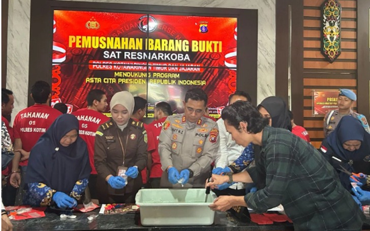 Sejumlah barang bukti narkotika hasil sitaan Satresnarkoba Polres Kotim dengan jenis sabu sebanyak 168 bungkus plastik dengan berat bersih keseluruhan 489,86 gram, dimusnahkan dengan cara dilarutkan di air dengan bahan kimia.