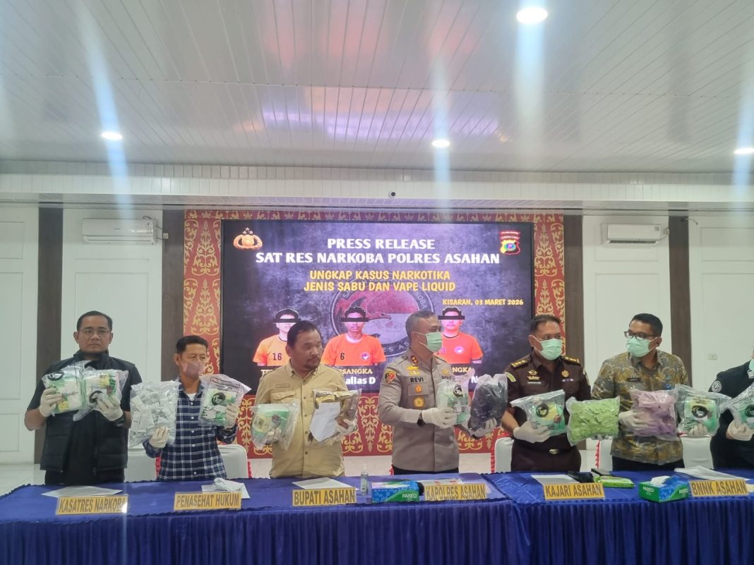 Gerbong Informasi.Com, Asahan – Satuan Reserse Narkoba Polres Asahan berhasil mengungkap dan menggagalkan peredaran narkoba seberat 10 Kg jenis sabu dan menangkap 3 orang pelaku bernama Amaludin Firdaus Panjaitan (34) warga Jalan Jamin Ginting, Tanjung Balai Asahan dan Darma Rusdiansyah (24) warga jalan Sei Pamali, Kota Tanjung Balai dan Faiz Hamid (23) warga Percut Sei Tuan, Kabupaten Deli Serdang , Sumut.