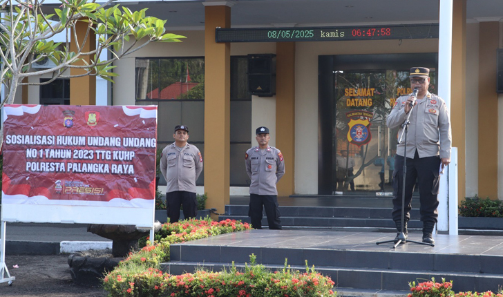 PALANGKA RAYA || gerbonginformasi.com – Seksi Hukum Polresta Palangka Raya melaksanakan sosialisasi Kitab Undang-Undang Hukum Pidana (KUHP) baru secara langsung di halaman apel Mapolresta Palangka Raya, Kamis (8/5/2025).